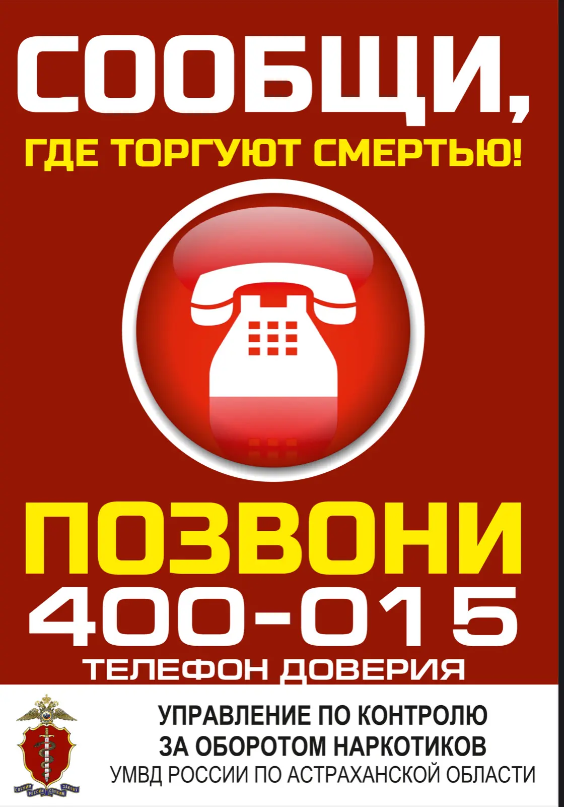 Управление по контролю за оборотом наркотиков УМВД России по Астраханской области начало первый этап Общероссийской акции «Сообщи, где торгуют смертью!». Профилактические мероприятия пройдут до 1 мая.