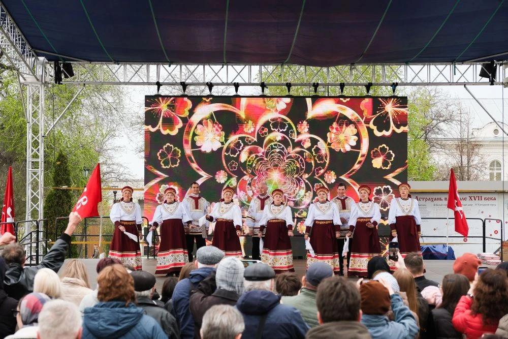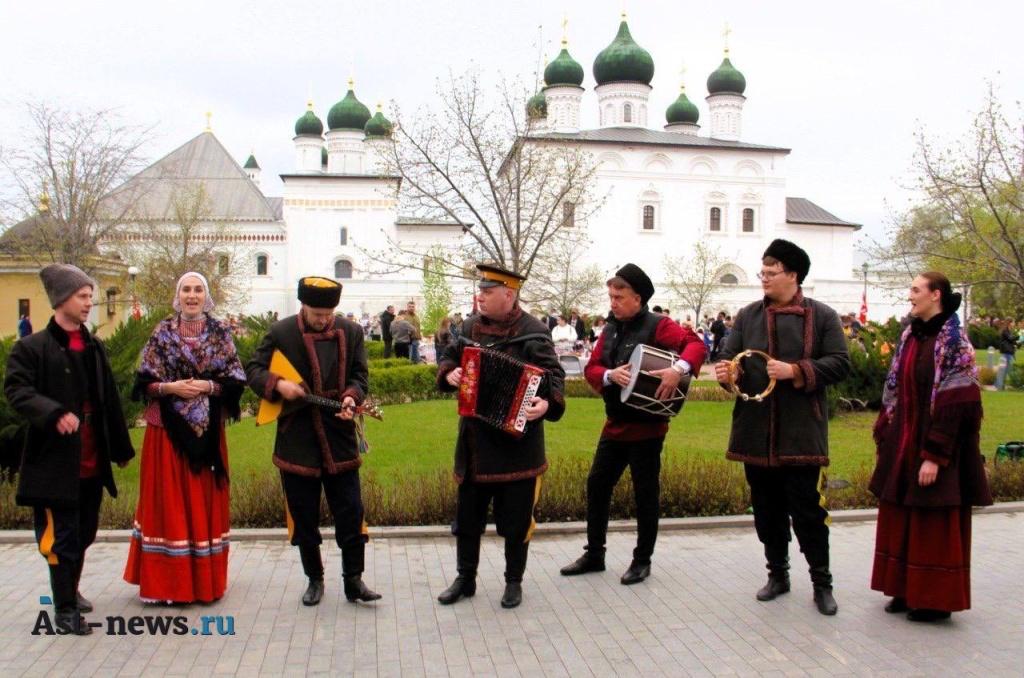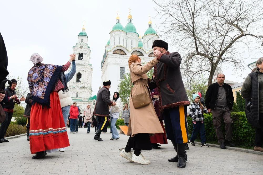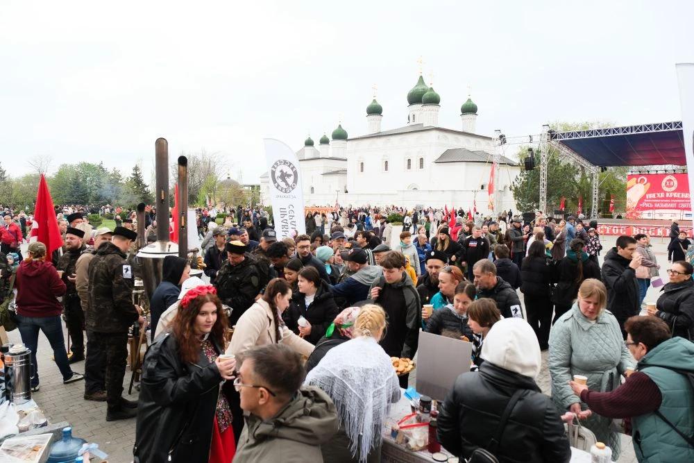 На Соборной площади Астраханского кремля люди делали памятные снимки в фотозонах, принимали участие в народных забавах, стояли в длинной очереди за бесплатными угощениями от «Русской общины», танцевали и пели.