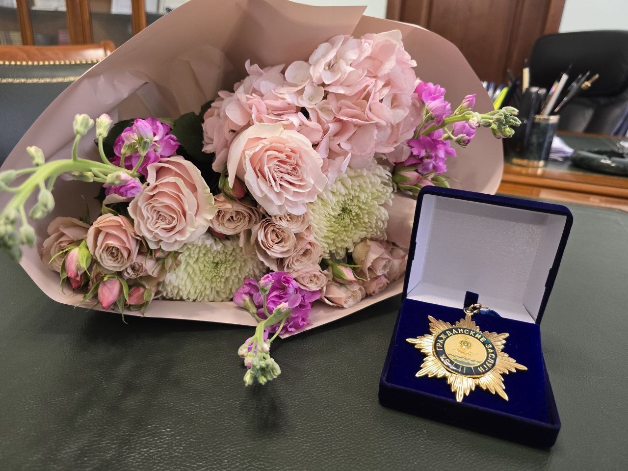 А сегодня я имел честь вручить ей еще одну награду – нагрудный именной почетный знак «За гражданские заслуги» II степени.