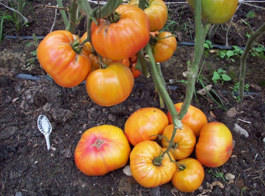 Томаты этого сорта впечатляют своим размером: они достигают от 200 до 400 граммов. Куст растёт до 1,5 метров. Плоды, претерпевающие интересные изменения цвета от зеленого до янтарного с полосами, обладают плоской округлой формой и выраженными рёбрами. Мясистая, сочная крахмалистая мякоть находится в пределах 6 семенных камер с мелкими семенами. Сладкий вкус с фруктовым ароматом не оставляет равнодушными, но важно учитывать, что они плохо хранятся и могут быстро перезреть. Средняя урожайность — 3-4 кг с растения.