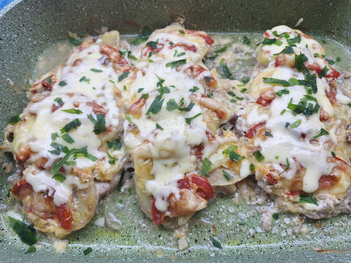 Помидоры нарезаются полукольцами и размещаются на картофеле. Они добавят сочности и немного кислинки, что дополнит сливочную разновидность соуса. Сыр натереть на крупной терке и посыпать сверху — всего немного, чтобы не затмить вкус индейки, но создать аппетитную корочку.