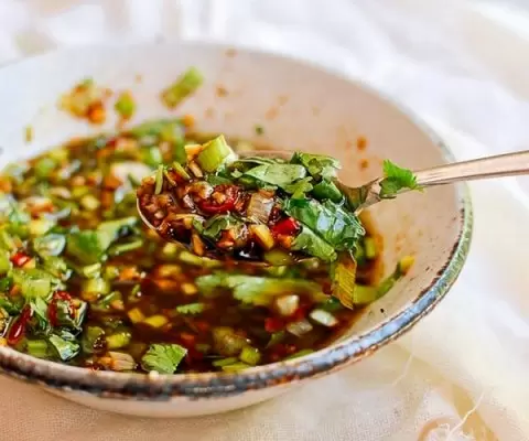 1. В жаропрочной миске расположите чеснок, имбирь, белую часть лука и чили. Не создавайте горку. 2. В сотейнике разогрейте растительное масло с сычуаньским перцем на слабом огне около 10 минут, не давая перцу сгореть. 3. Уберите перец и доведите масло до дымка, затем аккуратно залейте ароматические ингредиенты, перемешивая. 4. Добавьте сахар, уксус, соевый и устричный соусы, кунжутное масло, соль и смесь Пяти специй. Хорошо перемешайте и в конце добавьте зеленую часть лука и кинзу.