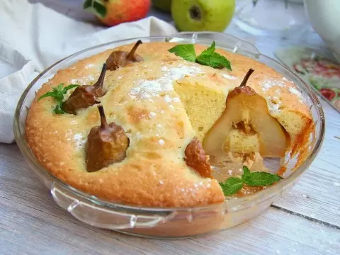 Подготовить форму диаметром 18 см, смазанную подсолнечным маслом. Выложить тесто равномерно по дну и вставить груши вертикально, слегка углубляя их в тесто. Отправить в предварительно разогретую до 180 °C духовку и выпекать около 40 минут. Готовность можно проверить, проткнув пирог шпажкой — она должна выйти чистой.
