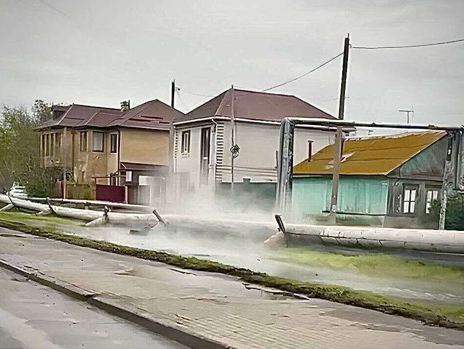 На улице Николая Островского обрушились опоры теплотрассы — труба опрокинулась, есть утечка горячей воды и сильный пар.